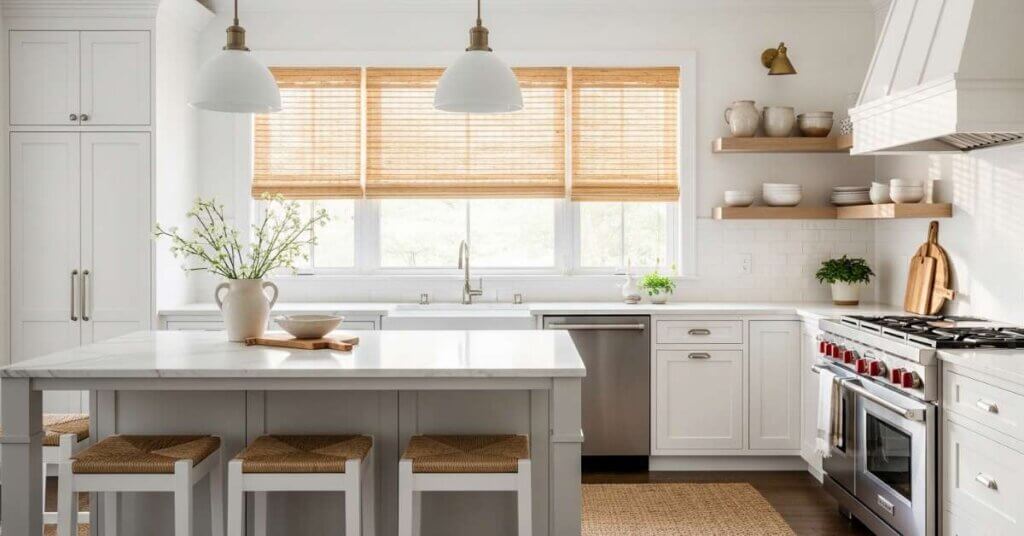 If your kitchen feels a little too crisp or unfinished, adding woven shades might be the missing piece.